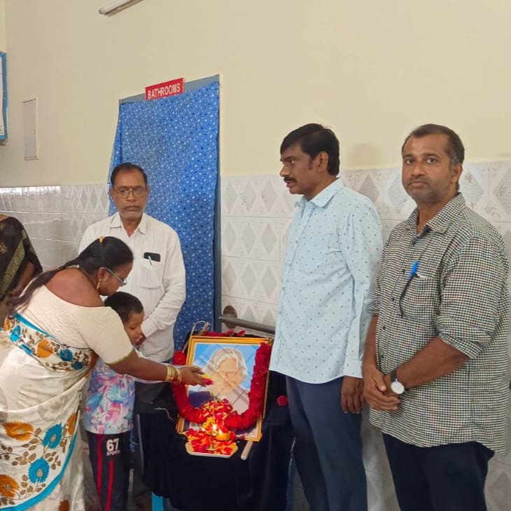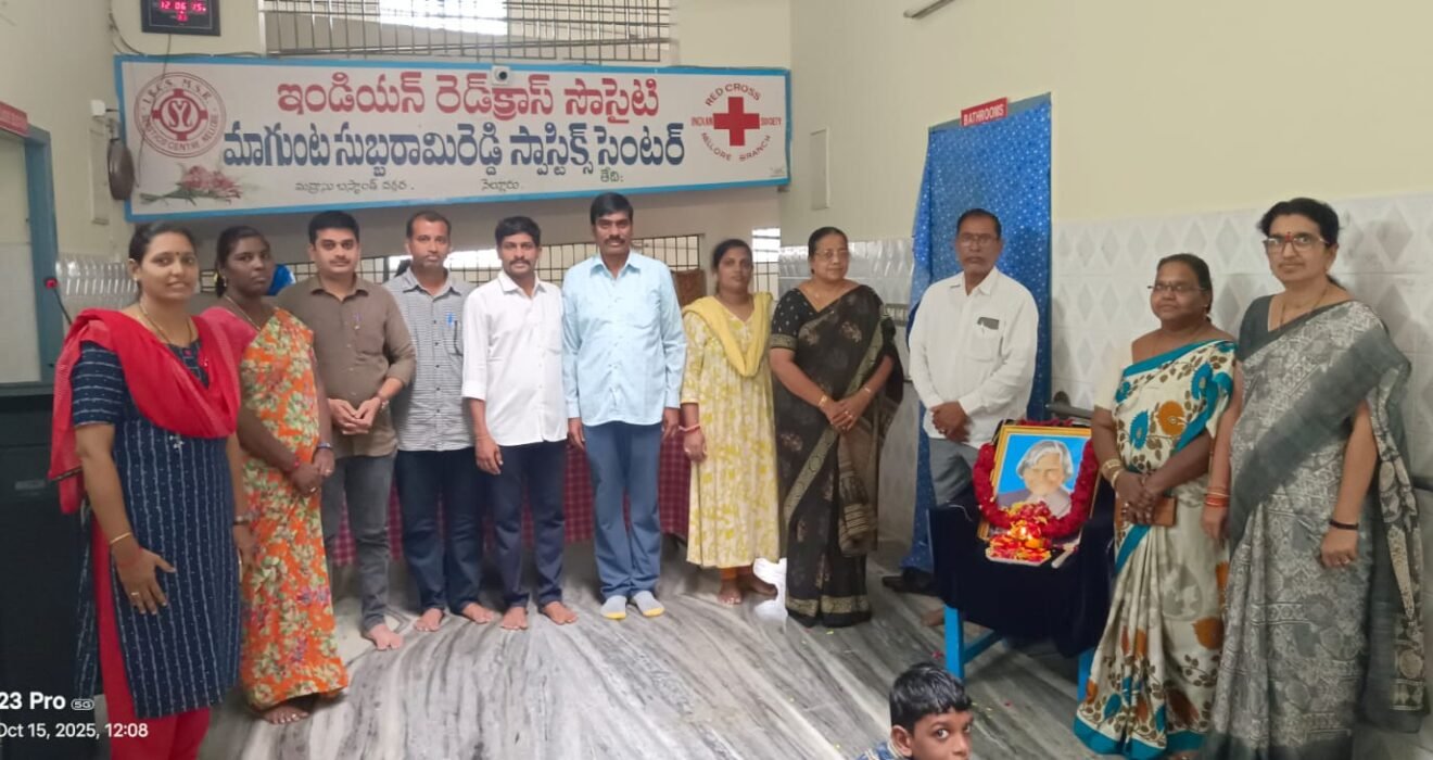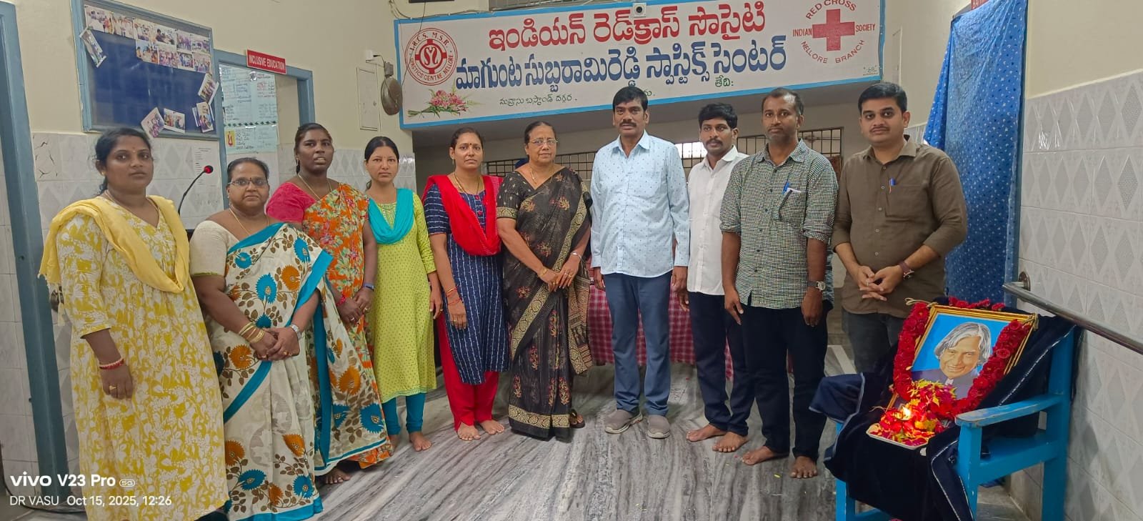 శ్రీ పొట్టి శ్రీరాములు నెల్లూరు జిల్లా తేదీ15/10/2025 ఇండియన్ రెడ్ క్రాస్ నెల్లూరు జిల్లా శాఖ చైర్మన్ శ్రీ వాకటి విజయ్ కుమార్ రెడ్డి గారి ఆదేశాల మేరకు భారత మాజీ రాష్ట్రపతి స్వర్గీయ ఏపీజే అబ్దుల్ కలాం గారి జయంతి సందర్భంగా అబ్దుల్ కలాం గారి జయంతి వేడుకలను ఇండియన్ రెడ్ క్రాస్ స్పాస్టిక్ సెంటర్ లో నిర్వహించడం జరిగింది. ఈ సందర్భంగా స్పాస్టిక్ సెంటర్ కోఆర్డినేటర్ శ్రీ దాసరి రాజేంద్రప్రసాద్ గారు మరియు నెల్లూరు జిల్లా రెడ్ క్రాస్ శాఖ కార్యదర్శి పి. మస్తానయ్య గారి చేతుల మీదుగా అబ్దుల్ కలాం గారి చిత్రపటానికి పూలమాల వేసి రెడ్ క్రాస్ స్టాస్టిక్స్ సెంటర్ సిబ్బంది, స్పాస్టిక్ సెంటర్ చిన్నారులు మరియు వారి తల్లిదండ్రులతో కలిసి నివాళులు అర్పించడం జరిగింది. అనంతరం మేనేజింగ్ కమిటీ సభ్యులు దాసరి రాజేంద్రప్రసాద్ గారు ప్రసంగిస్తూ